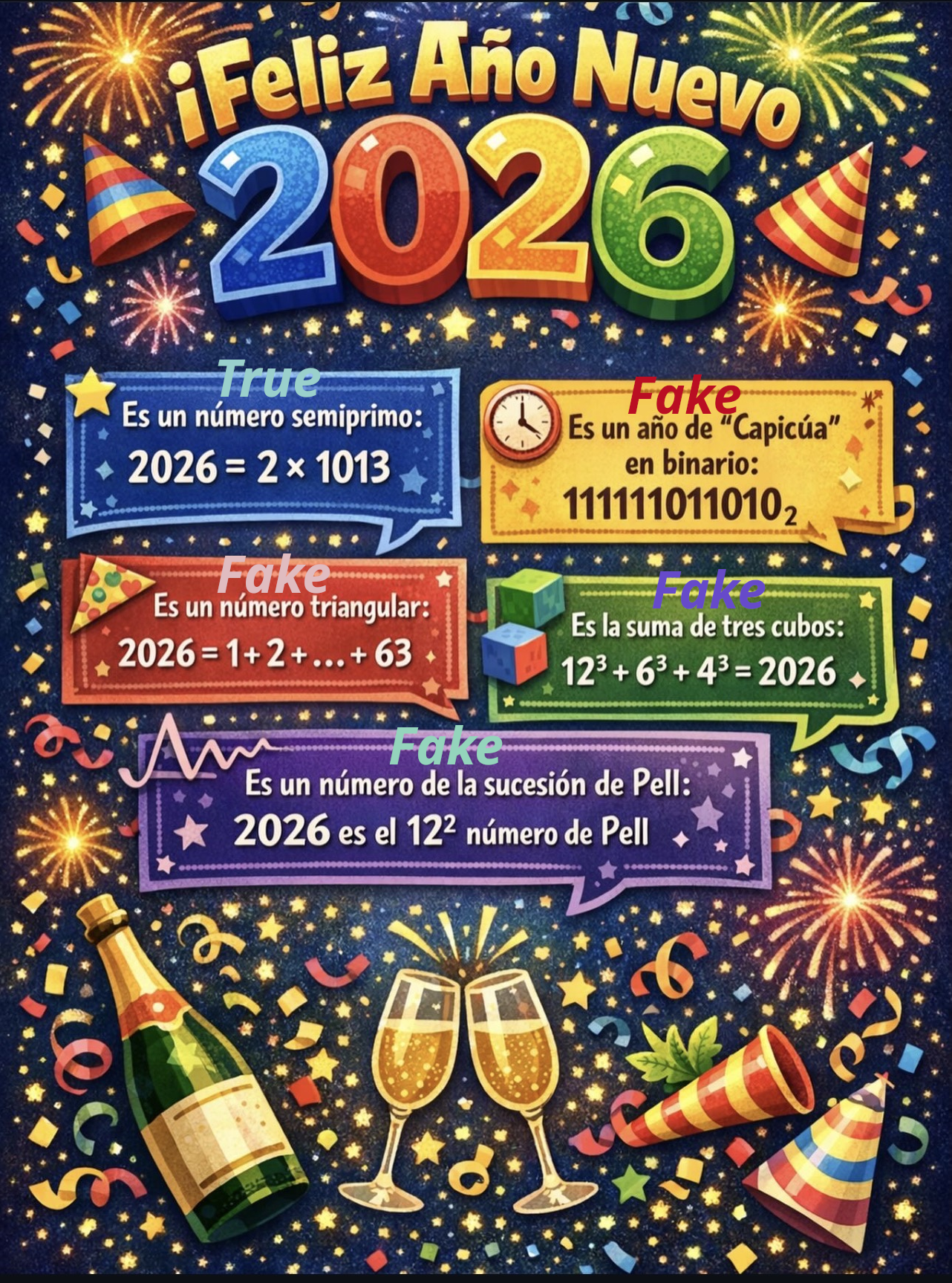 OJO con la IAs: Este es un claro ejemplo de cómo las IAs “la cagan” . De las cinco afirmaciones que da solo la primera es cierta (la de que es un número semiprimo); las otras cuatro son falsas. ESTA IMAGEN LA HA GENERADO AUTOMÁTICAMENTE ChatGPT DICIÉNDOLE QUE PONGA CURIOSIDADES MATEMÁTICAS DEL NÚMERO 2026. Así que OJITO CON LO QUE TE DICEN LAS IAs.