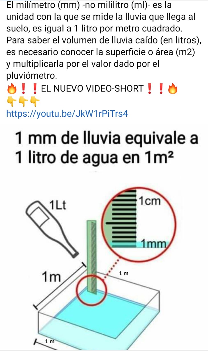 Es decir 1 litro por metro cuadrado es igual al agua que cabe en un recipiente de base cuadrada (de un metro de lado) y altura de 1 milímetro (mm). Eso nos daría un volumen de 10^6 = 1000*1000*1 milímetros cúbicos (mm^3) que, al pasarlos a litros, sería un litro (pues 1 litro = 1 dm^3 = 10^6 mm^3).