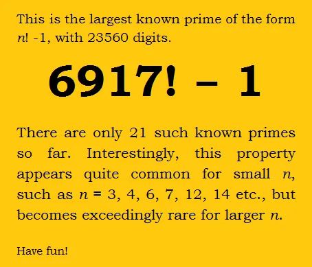 Traducción: "Este es el número primo más grande conocido de la forma n!-1, con 23560 dígitos: 6917! - 1. Hasta ahora,