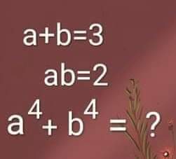Sale 17, porque primero sí o sí debemos saber el valor de A y B, y no sumar defrente A + B, que es igual a 3. Solamente eso se aplica cuando es multiplicación. Así que, sí A + B = 3 y el producto de a y b es igual a 2 A puede ser igual a 1 y B a 2, o incluso a viceversa. Pero eso no altera la respuesta, porque el exponente es igual en los dos. Ahora 1 elevado a la cuarta es 1, y 2 a la cuarta es 16, debemos sumar 16 + 1, que da como resultado 17.