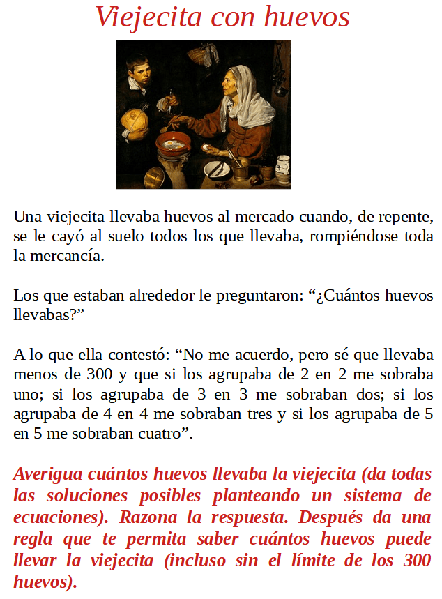 19/07/2022 by profe.mates.jac Viejecita con huevos Imagen 1ºBachillerato Ciencias, 2ºBachillerato CC.SS, 2ºBachillerato Ciencias, Problemillas y Acertijos Deja un comentario Compártelo: Compartir en X (Se abre en una ventana nueva) X Compartir en Facebook (Se abre en una ventana nueva) Facebook Me gusta Cargando... Relacionado