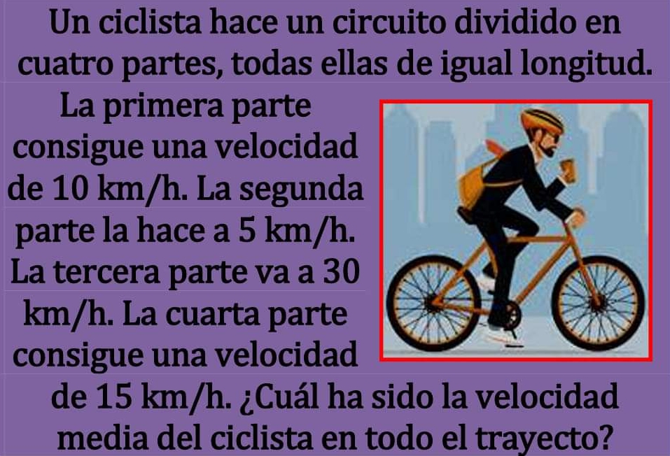 10/08/2023 by profe.mates.jac Velocidad media del ciclista Imagen 3ºESO Académicas, 4ºESO, Problemillas y Acertijos Deja un comentario Compártelo: Compartir en X (Se abre en una ventana nueva) X Compartir en Facebook (Se abre en una ventana nueva) Facebook Me gusta Cargando...