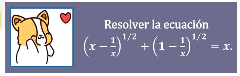 27/07/2024 by profe.mates.jac Resolver la siguiente ecuación irracional Imagen 2ºBachillerato Ciencias, Problemillas y Acertijos Álgebra Deja un comentario Compártelo: Compartir en X (Se abre en una ventana nueva) X Compartir en Facebook (Se abre en una ventana nueva) Facebook Me gusta Cargando...