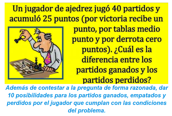 15/11/202415/11/2024 by profe.mates.jac El jugador de ajedrez 1ºBach. CCSS, 1ºBachillerato Ciencias, 4ºESO, 4ºESO Académicas, Problemillas y Acertijos Álgebra Deja un comentario Además de contestar a la pregunta de forma razonada, dar 10 posibilidades para los partidos ganados, empatados y perdidos por el jugador que cumplan con las condiciones del problema. Compártelo: Compartir en X (Se abre en una ventana nueva) X Compartir en Facebook (Se abre en una ventana nueva) Facebook Me gusta Cargando...