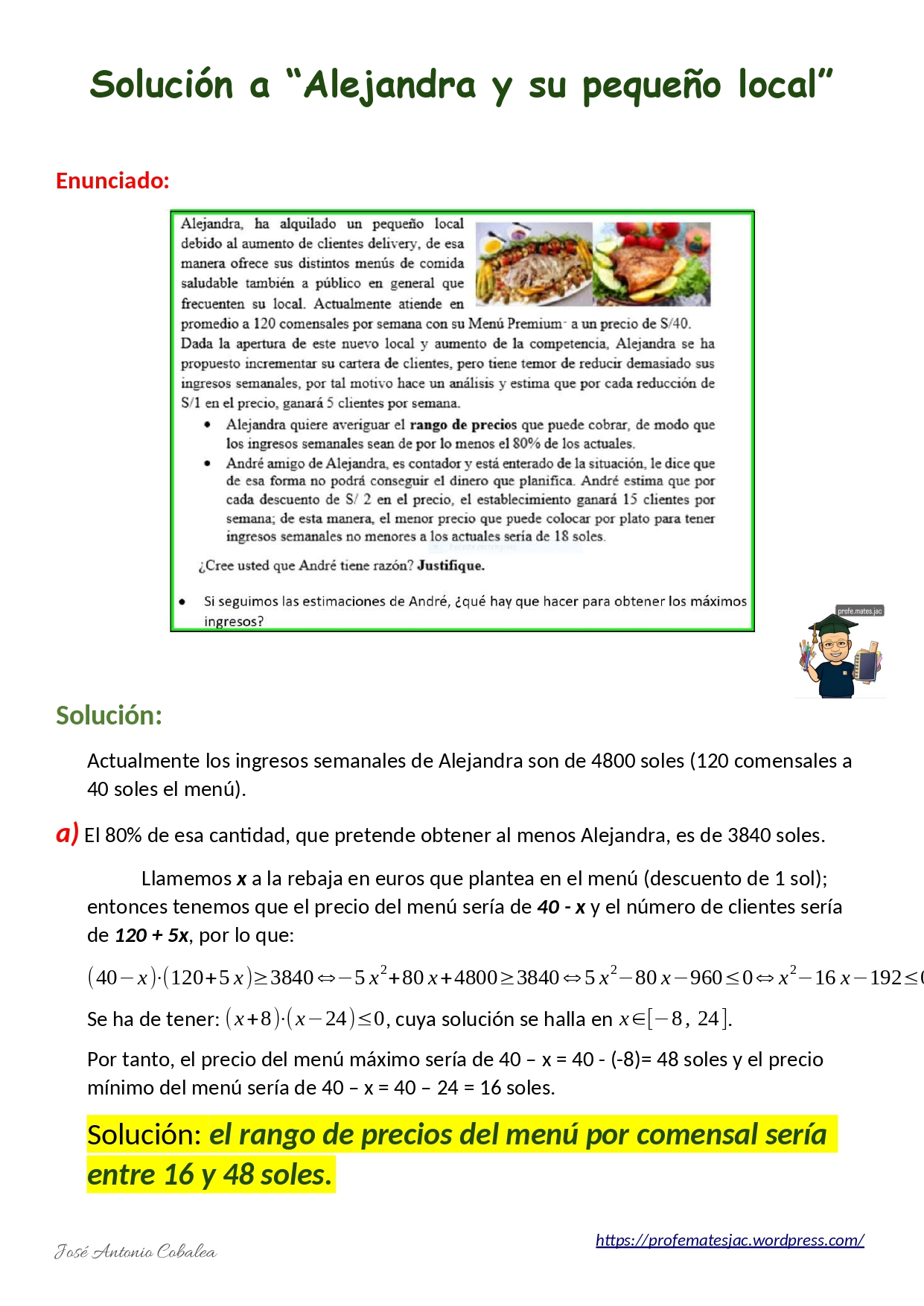 01/10/2025 by profe.mates.jac Solución a «Alejandra y su pequeño local» 2ºBachillerato CC.SS, 2ºBachillerato Ciencias, SOLUCIONES Álgebra, Derivadas Deja un comentario Compártelo: Compartir en X (Se abre en una ventana nueva) X Compartir en Facebook (Se abre en una ventana nueva) Facebook Me gusta Cargando...